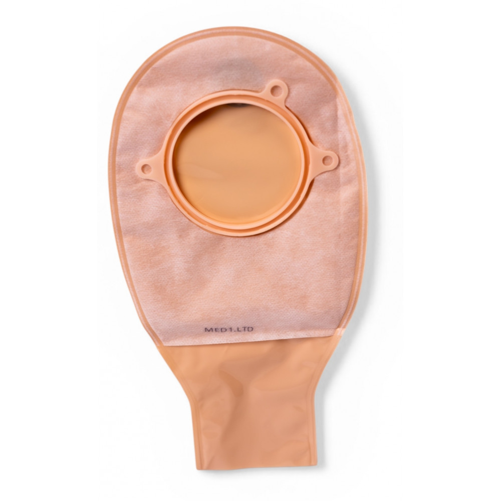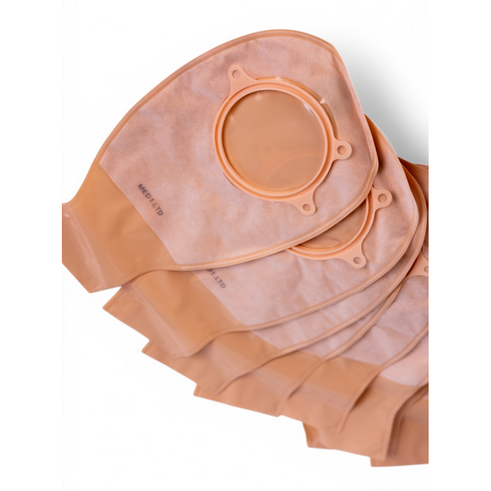 The MED1-OS05-70 two-piece open-type ostomy bag with filter and plastic clamp (bag), 70 mm opening, is a replaceable bag for a two-piece ostomy system designed for reliable and comfortable collection of intestinal contents during ostomy. Suitable for use with a plate (base) with a corresponding flange diameter of 70 mm.